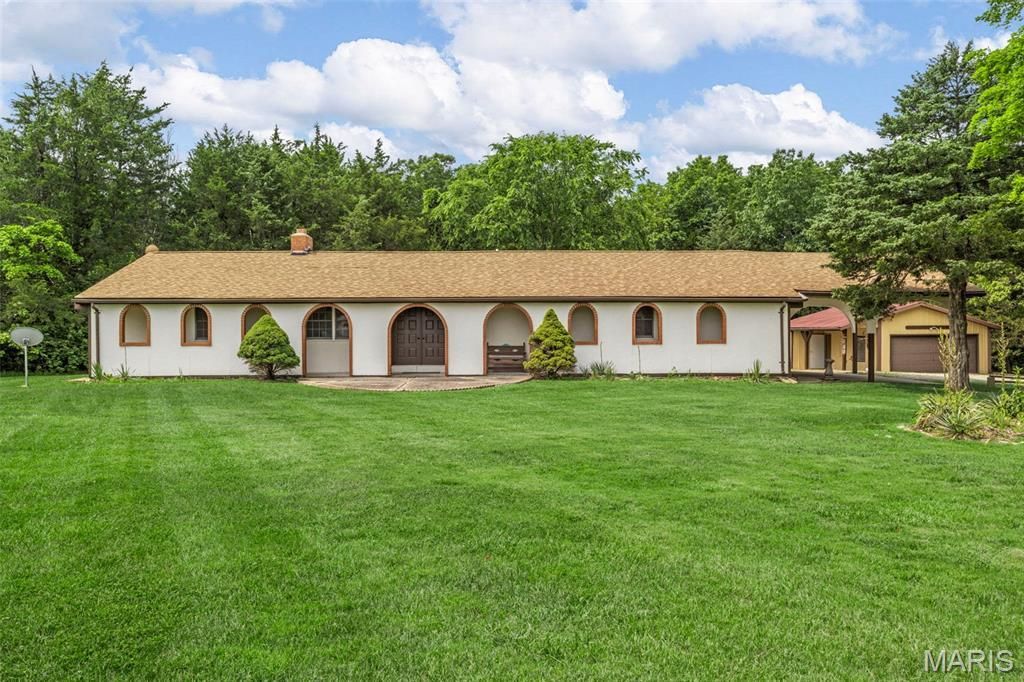 Discover this custom built, Spanish Colonial ranch, offering the perfect blend of charm, comfort, and functionality. This 2-bed, 2-bath, open floor plan home is situated on 3+ wooded acres with a pond. Outside, you can relax on partially covered patios located at the front and back of the house. This property offers ample garage space both attached and detached, totaling six garage spaces, and two outdoor covered spaces. As you step inside to fresh paint and new flooring, you'll be greeted by vaulted ceilings with exposed wood beams and a wood burning fireplace. This open concept living space has a center island and updated lighting. Next to the garage is a utility/laundry room that also functions as a full bathroom with a walk-in shower.The two bedrooms have a connecting bathroom with tub/shower combo.Located less than seven miles from I-70, enjoy rural living, twelve minutes from town!